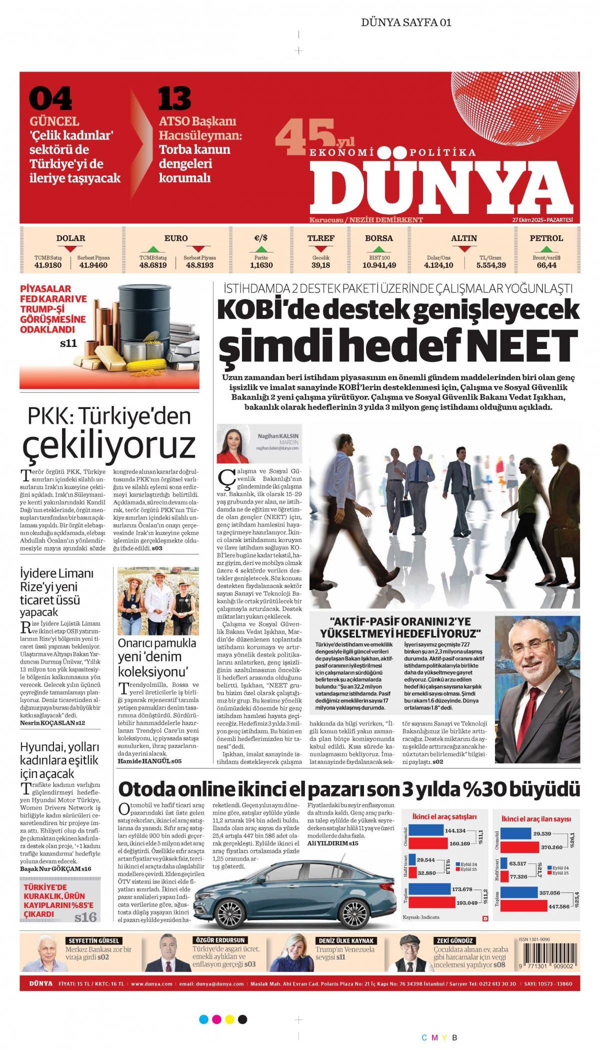 Dünya Gazetesi 27 Ekim 2025, Pazartesi Günü Manşeti