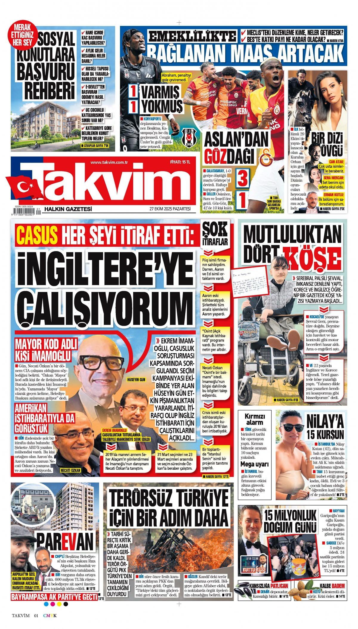 Takvim Gazetesi 27 Ekim 2025, Pazartesi Günü Manşeti